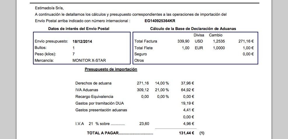 Lo envío ipso facto y me contestan (sin estrés, oiga) día y medio después con el presupuesto -a.k.a. impuesto revolucionario- para poder completar el envío: 131 euros. Casi un 50% sobre la cantidad original. El aparente chollo inicial ya no lo es tanto, y aunque imaginaba que tendría que pagar aduanas, suponía que serían más o menos la mitad. Ingenuo de mí, porque sé que hay calculadoras para hacerse una idea de esa tasa. La primera en la frente.