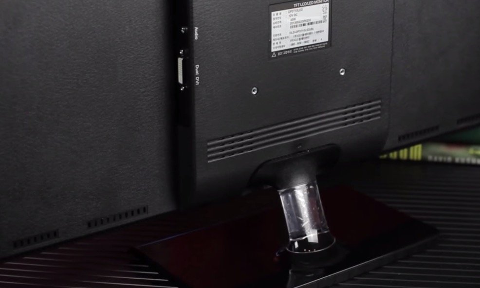 El sábado por la mañana tuve una media hora para echarle un vistazo al monitor. Lo conecté a la entrada Dual DVI (la única incluida) sin fijarlo al soporte, en plan rápido, y vi que aparentemente funcionaba, dos minutos y listo porque no tenía tiempo de más. La idea era montarlo en el soporte de pared que tengo en el despacho de casa, algo en lo que había tenido cuidado de mirar: este monitor sí tenía posibilidad de montarlo con la habitual montura VESA.
