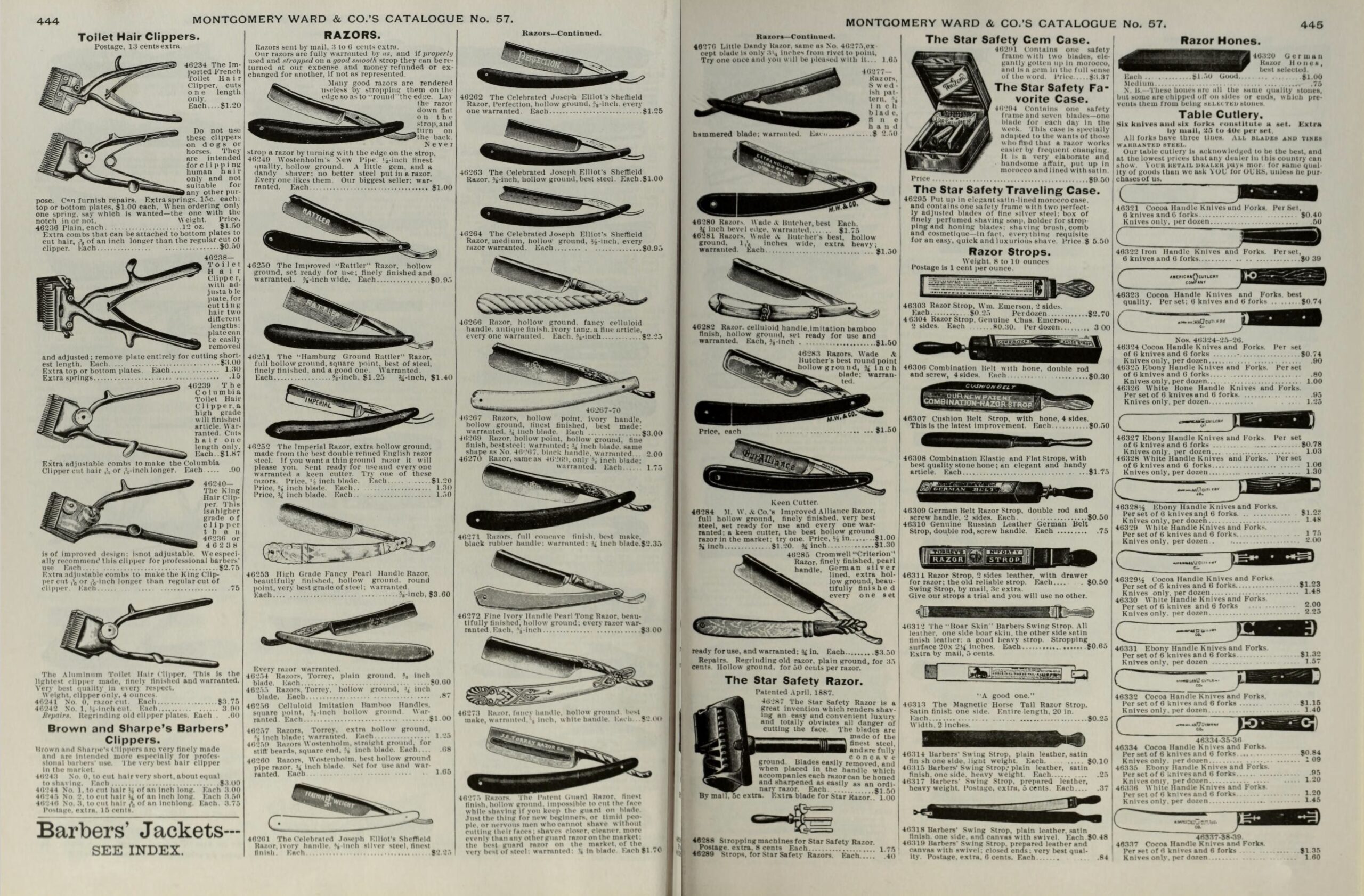 Pero como decíamos, en 1895 el catálogo de Montgomery Ward & Co. era toda una institución. Entre sus 624 páginas —con más de 25.000 productos en venta— había una sección dedicada a navajas de afeitar.