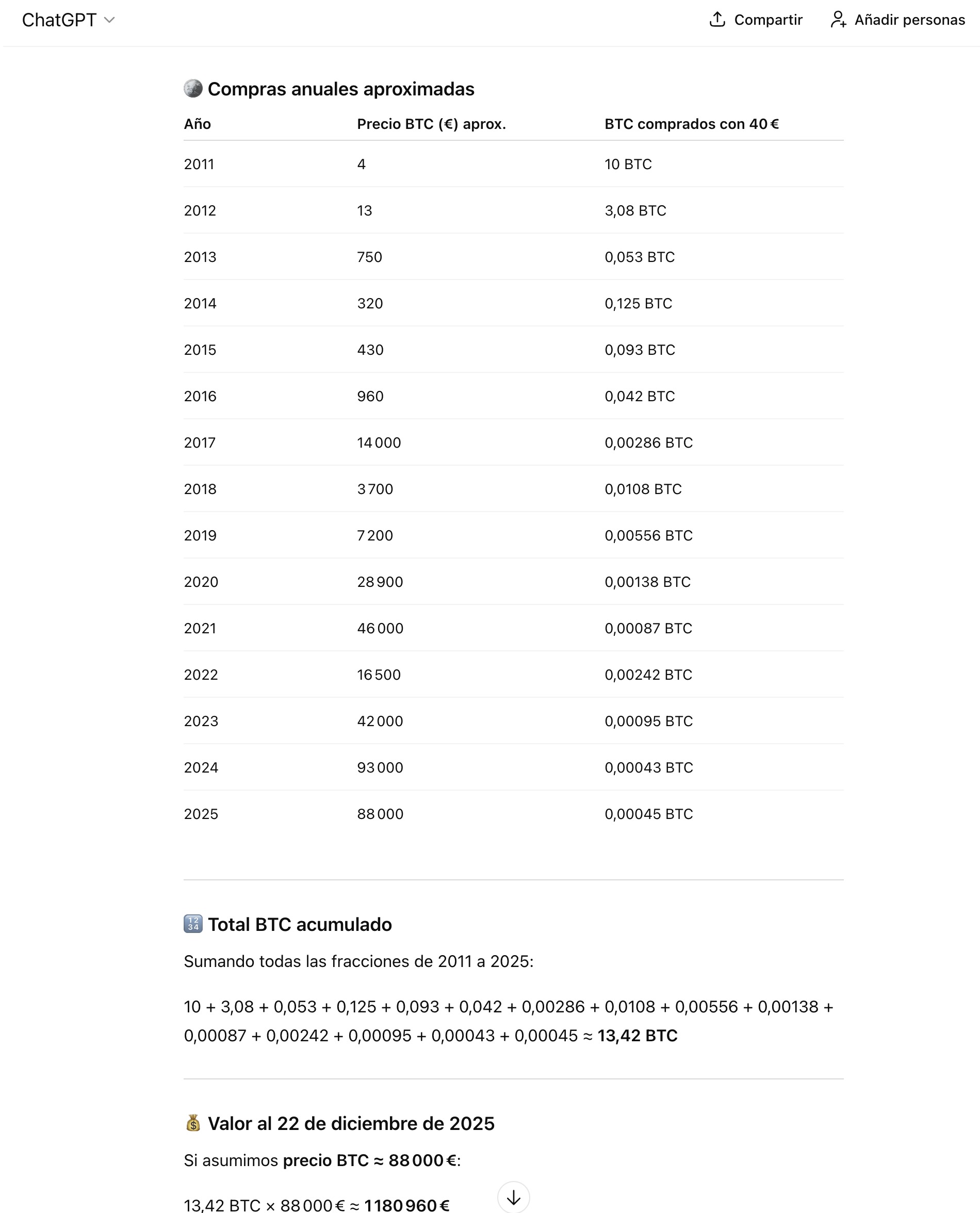 Sobre todo porque lo que tenía que haber hecho todos estos años es invertir esos 20 euros, o 40, o lo que fueran, en bitcoin. Me dice ChatGPT que si lo hubiera hecho (pongamos 40 euros, venga) desde que ella y yo nos juntásemos —antes de que aparecieran los bitcoins— y por ejemplo hubiera descubierto los bitcoins en 2011, ahora tendría según ChatGPT 13,42 BTC, que al cambio actual —y bitcoin ha caído un porrón, amigos, esto no es recomendación de compra, yo solo lo digo— serían 1,18 millones de euros.