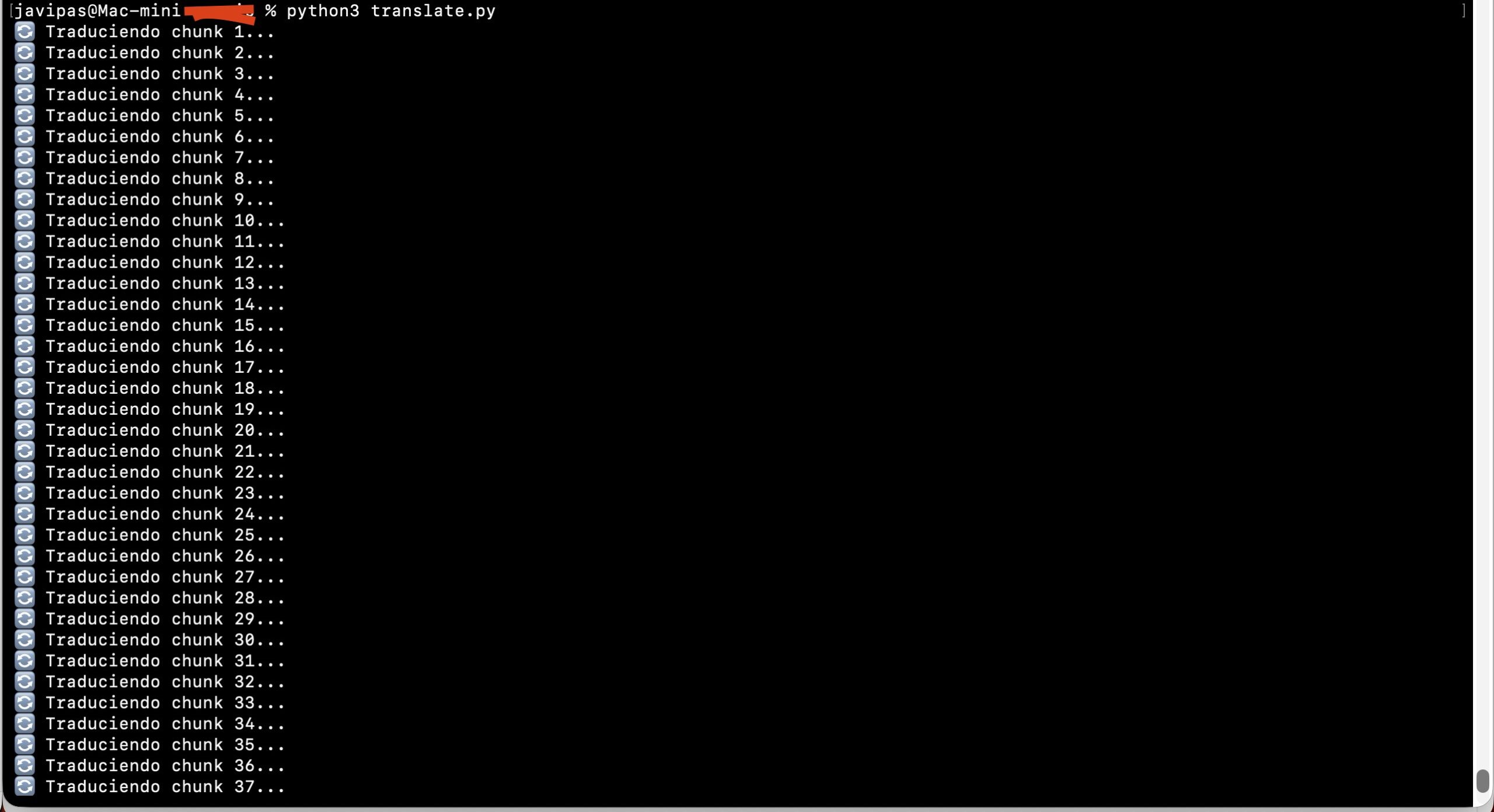 La primera, conseguir una traducción al español de cierto libro en chino al que quería echar un vistazo. Solo hay edición en chino, así que tras convertirlo a txt lo he dividido en pequeños trozos que luego he ido traduciendo mediante qwen3:8b. En realidad no lo he hecho yo, claro: le he preguntado a Gemini cómo hacerlo y me ha generado un par de scripts, primero para partir el txt en trocitos (213) que luego ir traduciendo uno por uno secuencial y automáticamente con el modelo Qwen 3 en mi Mac. Va despacito, pero está haciéndolo, a ver qué tal el resultado pero en las pruebas iniciales la verdad es que era bastante legible (aunque se notaba el tono robótico, claro).