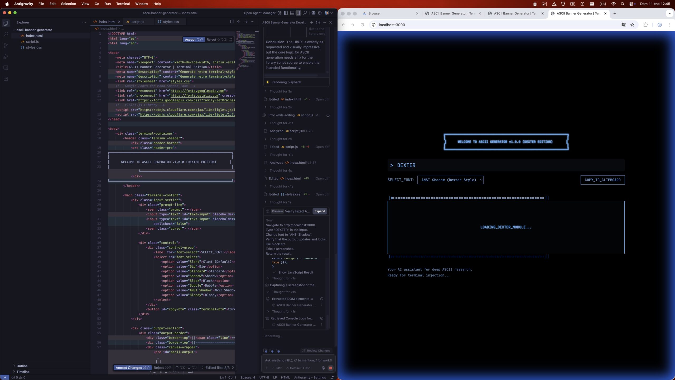 Me molan esos banners, así que como estaba ahí mirando cómo Dexter iba sacando el informe y Antigravity estaba sin trabajo, he creado un nuevo directorio vacío en mi Mac, lo he abierto en Antigravity y le he dicho que me generara una webapp para poder generar banners en ASCII Art. Gemini me ha ayudado —cómo no— a crear un prompt más detallado para dejar todo más claro, y al copiarlo y pegarlo en Antigravity ha empezado a planear cómo iba a hacerlo y se ha puesto manos a la obra.