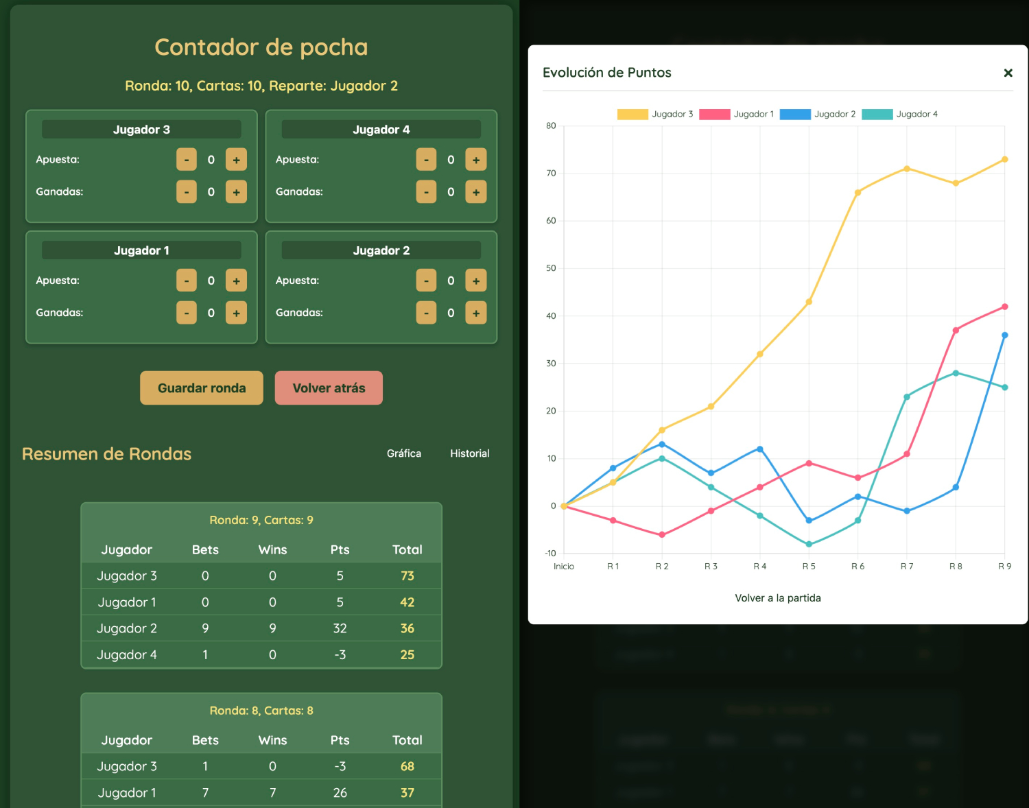 Detectamos varios fallos en una partida hace unos días y tras apuntarlos me puse a hacer los cambios pertinentes. Poder retroceder un turno si me había equivocado con las puntuaciones, algún aviso de que se cumpliera cierta norma que no había comprobado, y mejoras en la gestión del historial y sobre todo de poder generar gráficas con la evolución de los jugadores y sus puntos en la partida. Todo eso llevó unas dos horas en las que como siempre bastó con ir diciéndole a Antigravity/Gemini lo que necesitaba.