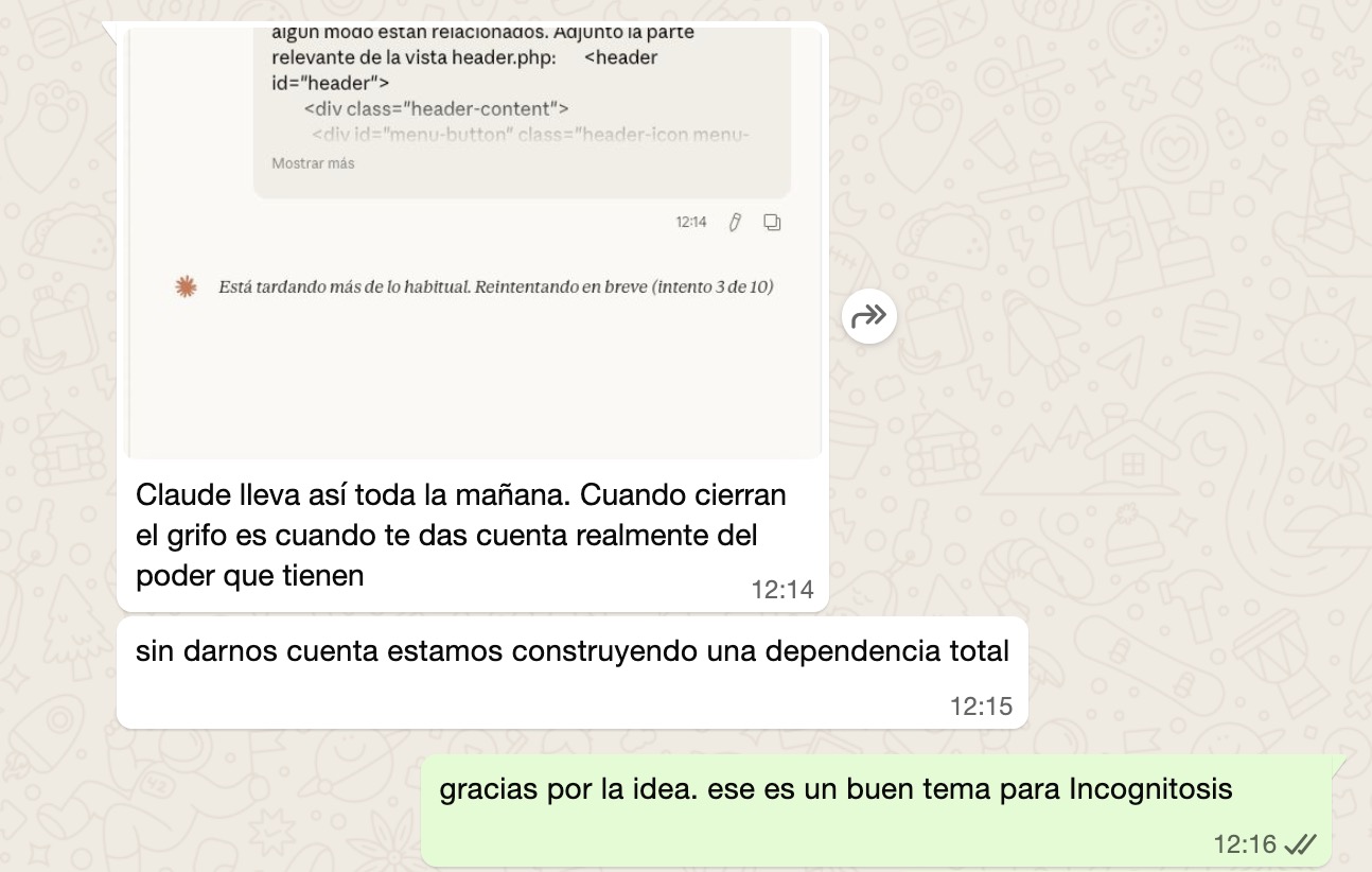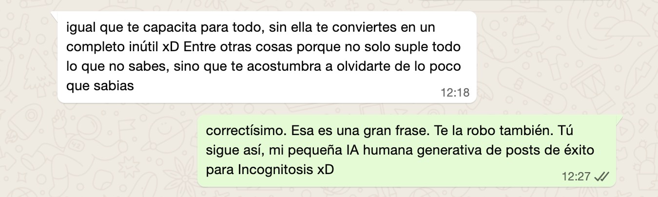 Seguíamos chateando Xavi y yo en WhatsApp y él, que lo tenía tan claro como yo, decía eso de la imagen. Esa misma IA que nos está permitiendo a todos hacer cosas que sin ella no podríamos hacer también se está convirtiendo en una amenaza, porque cuando algo o alguien hace todo por ti (aunque tengas que pagar por ello), te acomodas y lo usas porque es práctico y lógico y normalmente razonable. ¿Para qué voy a ir andando a Soria si puedo ir en coche? ¿Para qué voy a hacer esta multiplicación a mano si tengo la calculadora? ¿Para qué voy a usar esta aplicación si puedo decirle a la IA que me haga una a medida?