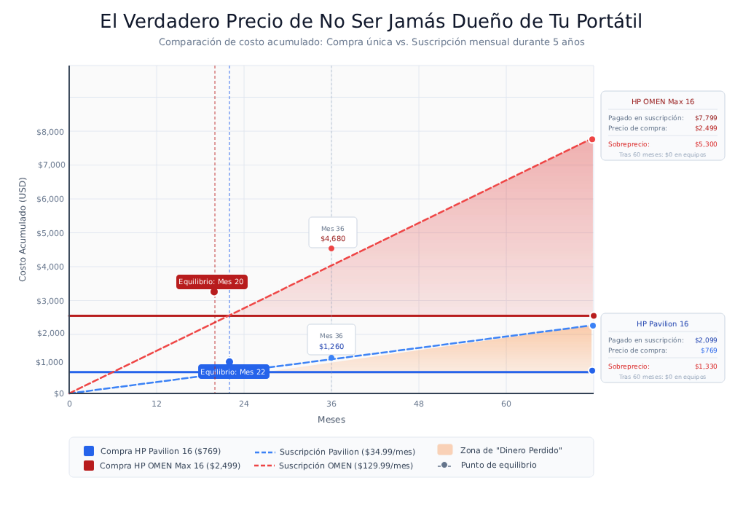 - HP Pavilion 16: cuesta 769 dólares si lo compras de forma tradicional, y HP te ofrece una suscripción de 34,99 dólares. Habrás llegado al punto de equilibrio el mes 22. Será entonces cuando habrás gastado en la suscripción lo que hubieras gastado si lo hubieras pagado a tocateja. A partir de ese momento estás pagando de más.