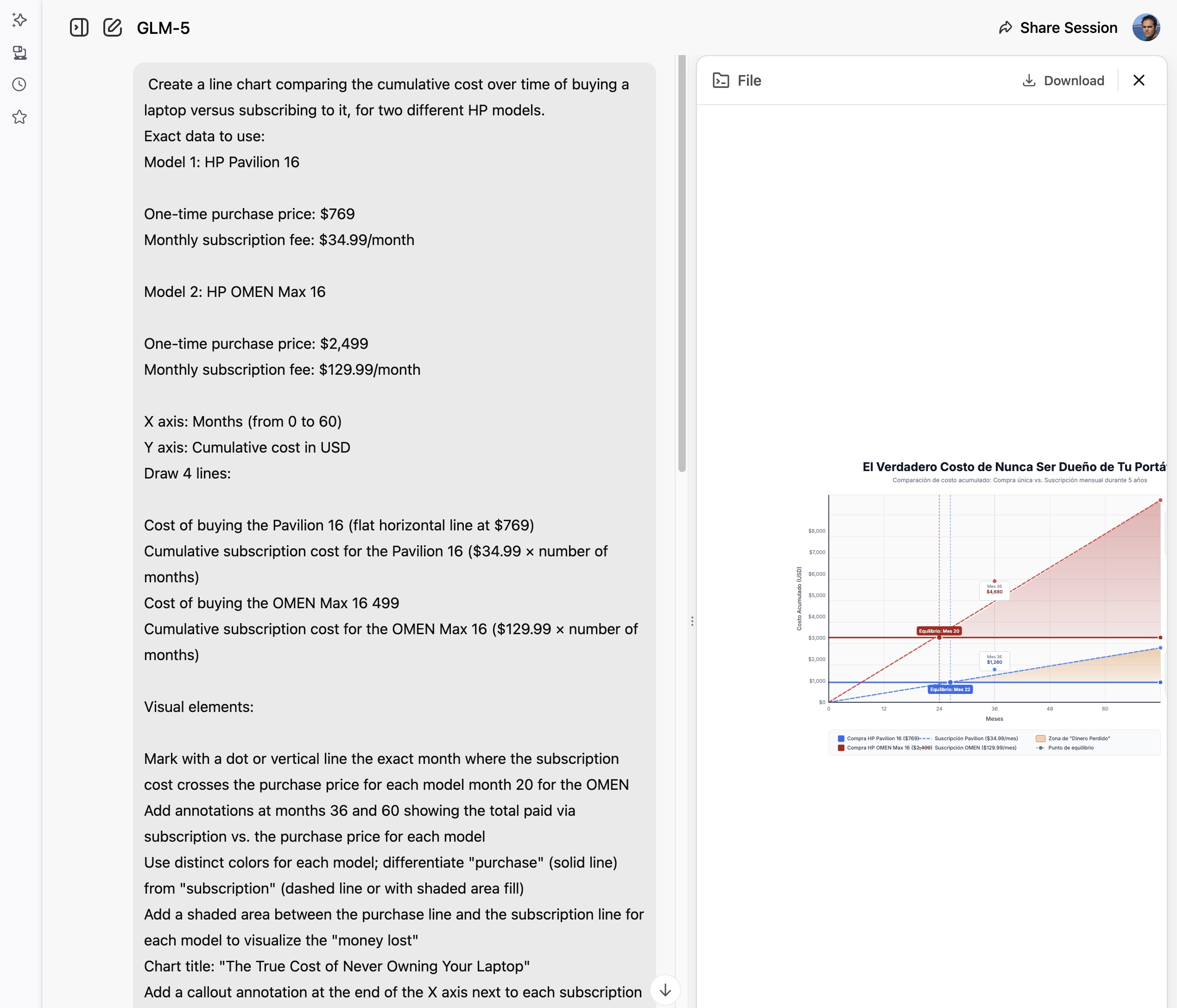 Hay una forma incluso más chula de verla: con un gráfico. Mi suscripción a Z.ai y a su modelo GLM sigue dándome alegrías, porque he podido probar ya el nuevo modelo GLM-5 y le he pedido que me hiciese una gráfica que reflejase esta situación. (Por cierto, si queréis probar y usáis mi afiliado, os rebajan el precio un 10% y a mí me dan créditos, aunque es verdad que han subido precios porque el modelo compite teóricamente con Opus 4.5).