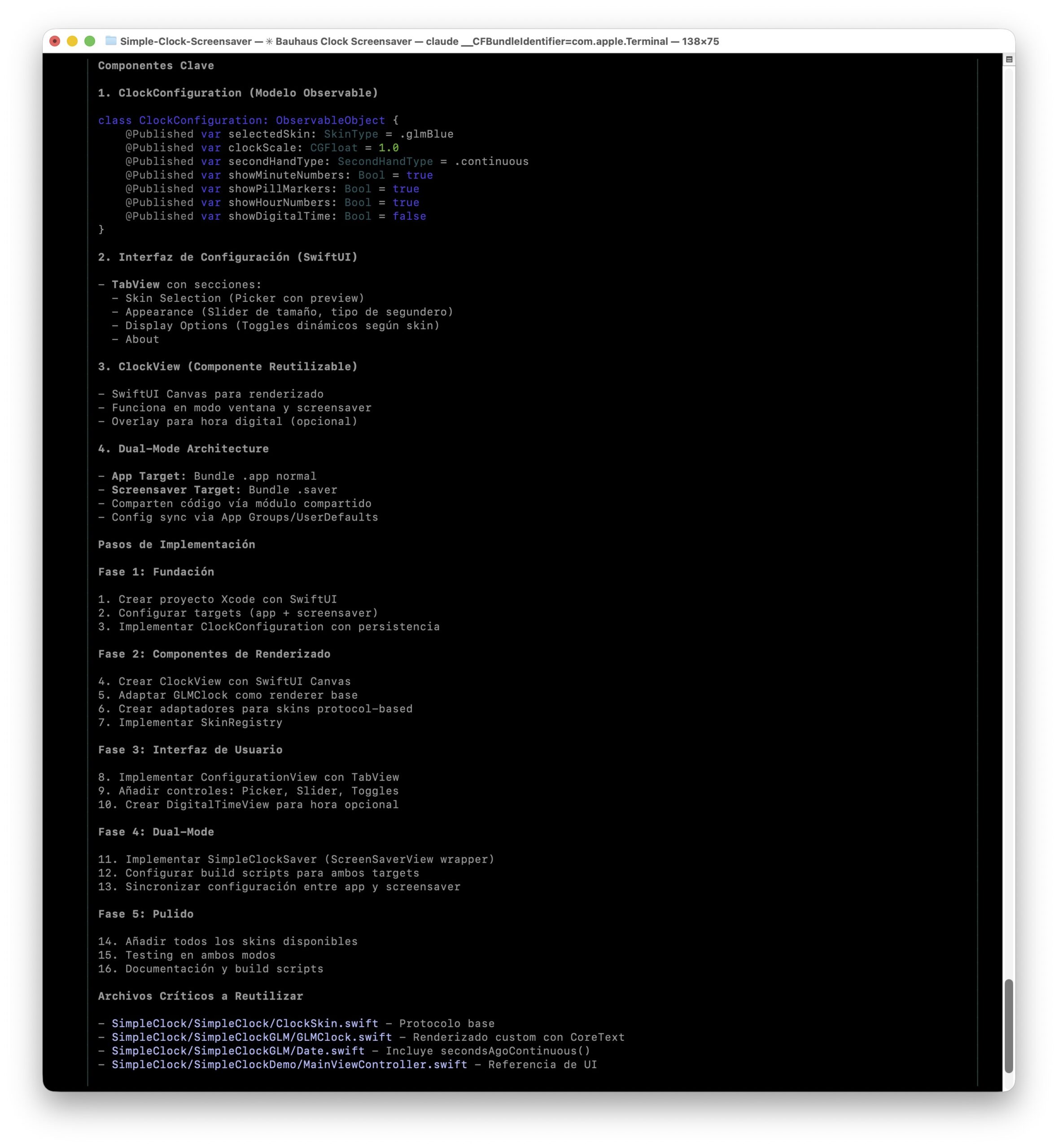 Como digo, básicamente empecé a pedirle a Claude Code que, con el código base de ese Simple Clock, me hiciera algo parecido al Bauhaus Clock. Para ello le fui arrastrando capturas de pantalla del diseño de Bauhaus Clock y pidiéndole que adaptara ese diseño al del SimpleClock. Lo primero que hizo fue crear un detallado plan de acción para luego ponerse a programar cuando yo le diera el OK, que es, claro, lo que hice.