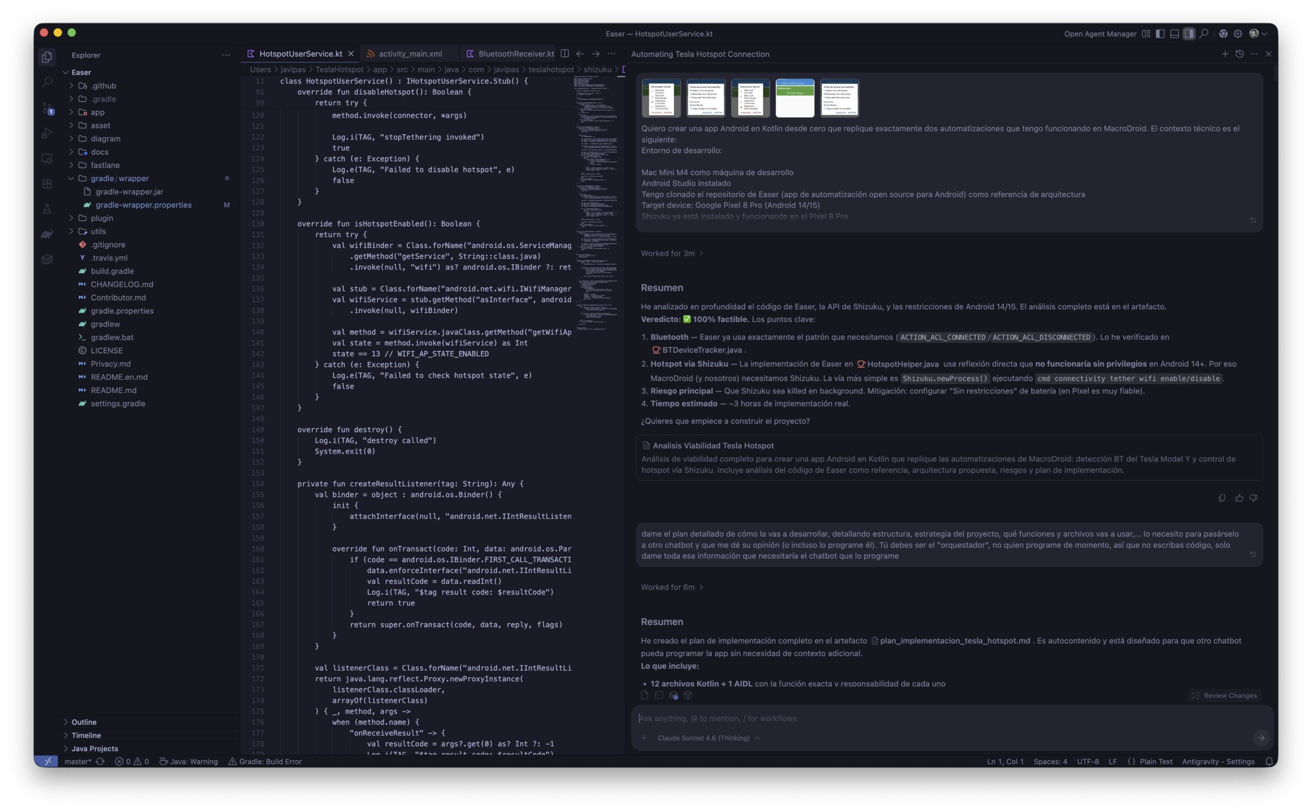 Así que ahí empecé a programar. O lo que es lo mismo, a hablar. Pegué alguna captura de las dos «macros» que había creado en MacroDroid, le expliqué lo que quería y le pedí que me dijera si era posible hacer algo parecido a partir del código de Easer. Aquí había un elemento especial: para poder usar MacroDroid había tenido que instalar Shizuku, una aplicación que da acceso a algunas APIs de sistema sin que el móvil tenga que estar rooteado. Eso normalmente no es buena idea, pero como soy yo quien se lo guisa y se lo come, no tengo problema y es un componente fundamental para lo que hacía MacroDroid con el Tesla.