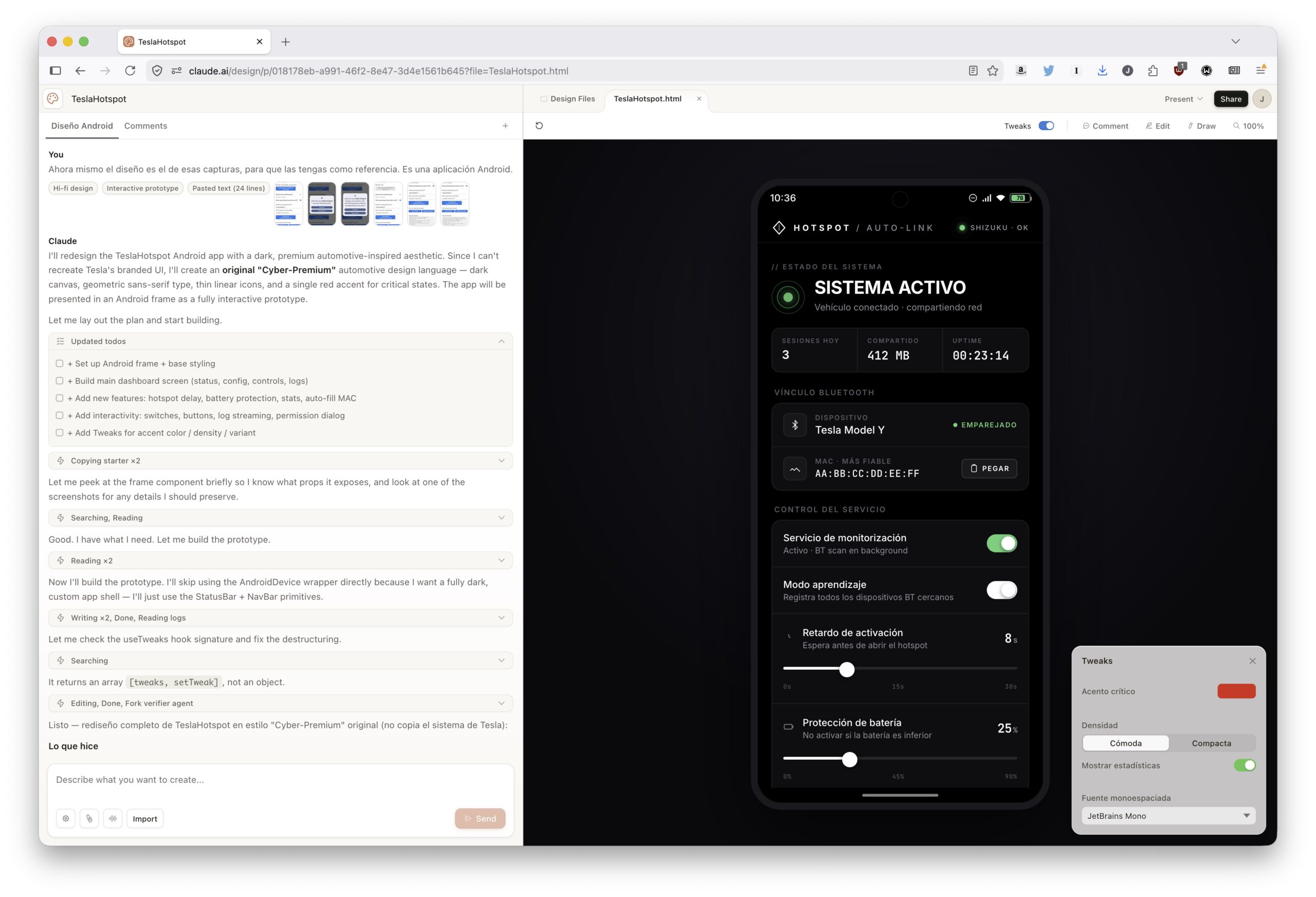 Pero ya me conocéis. Soy un tipo atento al detalle, perfeccionista y cabezón. La interfaz de la app me parecía funcional pero feota, así que quise darle un tiento a otra herramienta que estoy probando estos días. Se trata de Claude Design, que he usado para un par de proyectos diferentes (quizá os hable de alguno pronto), y que me parece absolutamente maravillosa. Como pagué una suscripción Pro de Claude de oferta durante tres meses (se me acaba ya), puedo usar la herramienta, así que primero le pedí a GLM que me creara un prompt para que otra app me diseñara la interfaz, y claro, me creó un prompt estupendo en el que yo solo indiqué que me gustaría que tuviera acabado «Tesla», ya sabéis, fondo oscuro, tipografías claras, moderna y elegante.