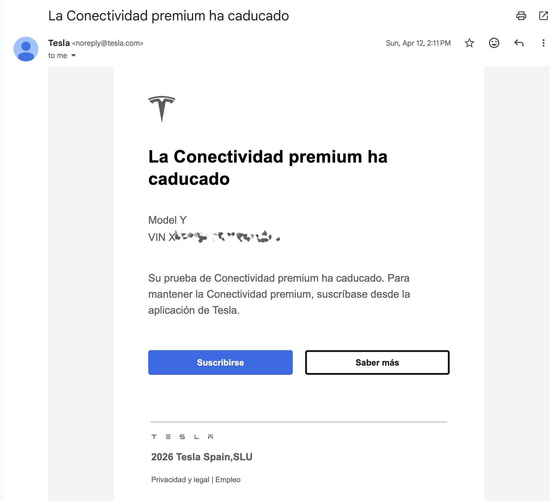 Llevamos mes y medio con el Tesla Model Y y hace un par de semanas me llegó el siguiente mensaje: