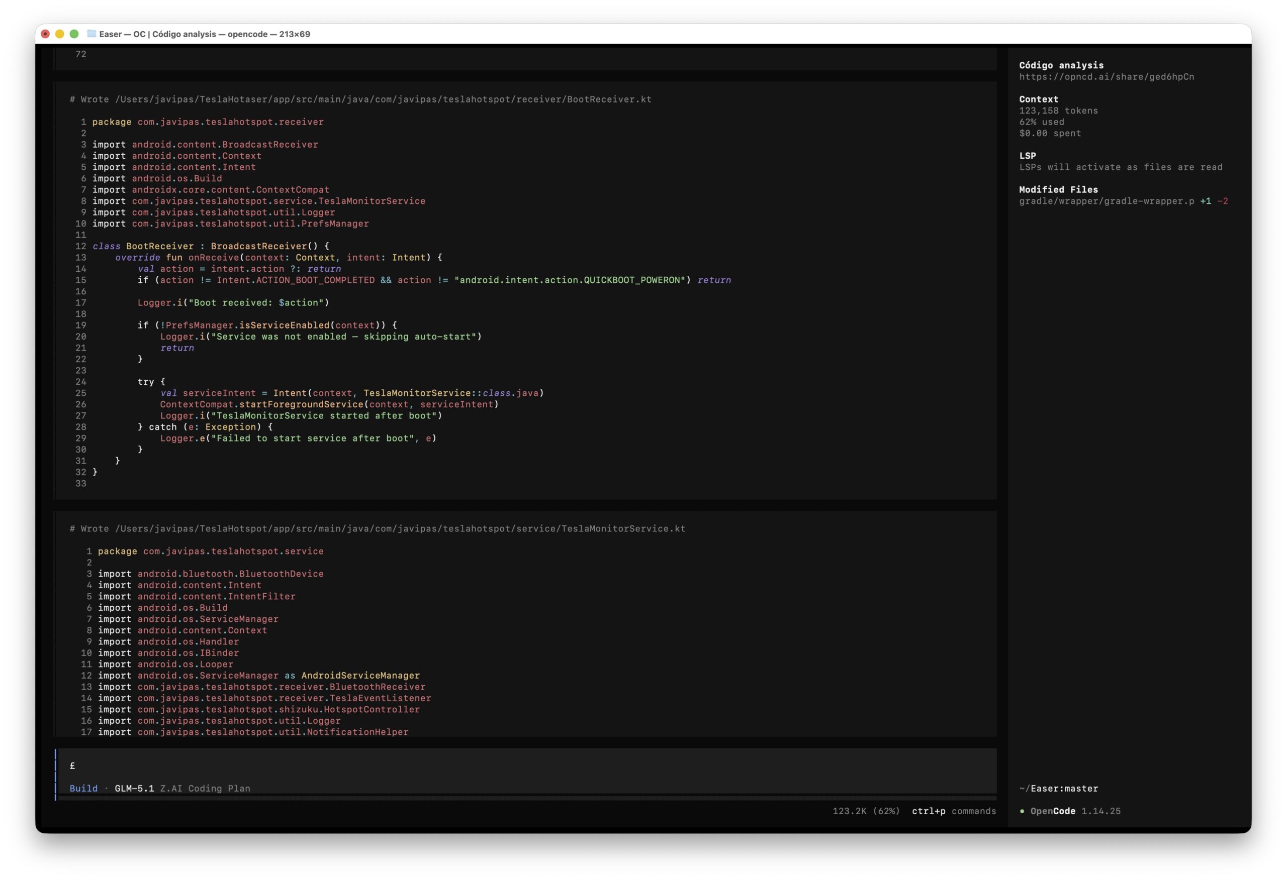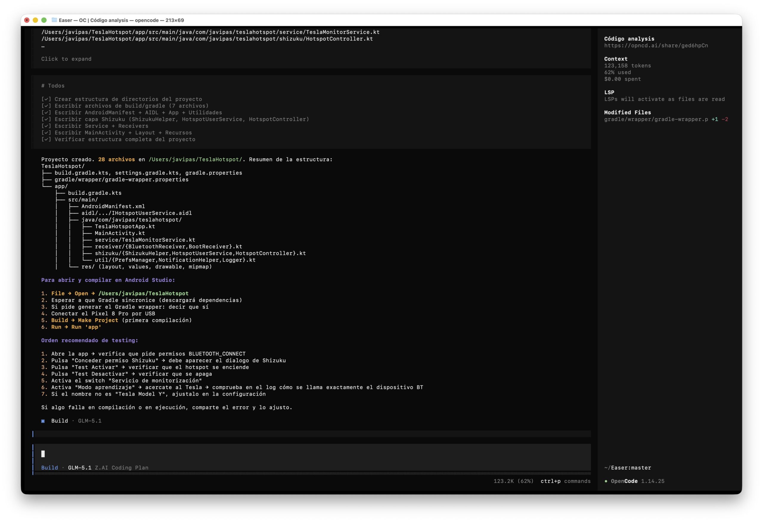Así que cloné el repo en mi Mac mini m4 (unos 3 segundos), hice un «cd Easer» y después lancé OpenCode, que tengo configurado con GLM 5.1. Y ahí comenzó el ciclo. Le pedí al modelo de IA que analizara el directorio y todo el código en él. Que me dijera lo que hacía pero sobre todo que me dijera si veía cosas raras. Siendo una app china las suspicacias son inevitables, pero el análisis me dejó claro que no había peligro y que podía usar ese código sin riesgos.