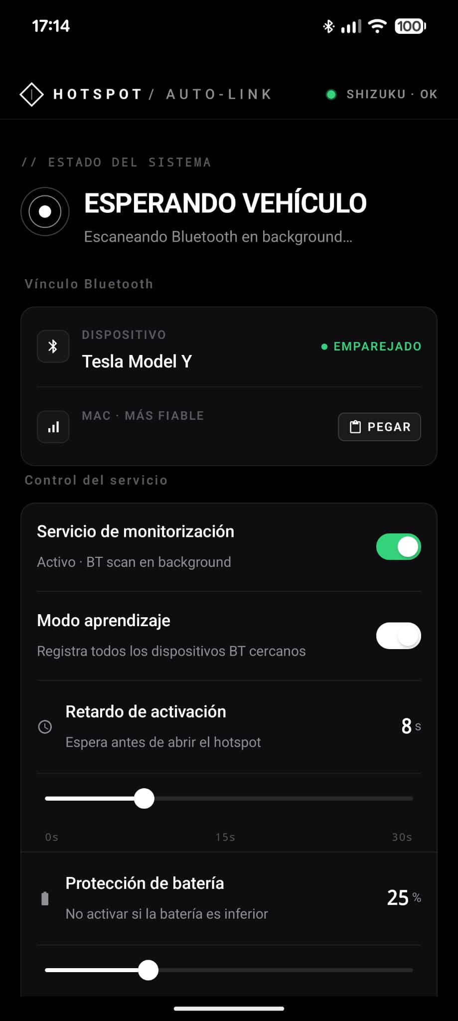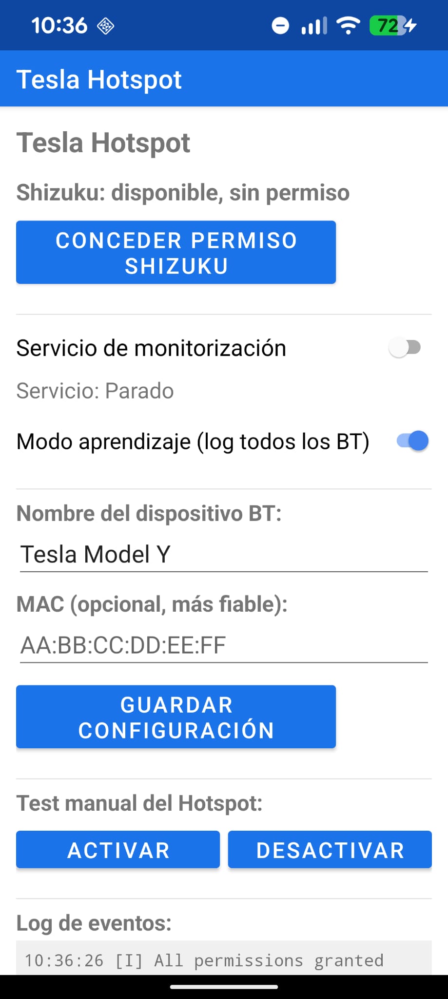 Uy, esto promete. El chatbot me comentó cómo manejar la app, que es bastante simple: le concedo permiso a Shizuku, activo la monitorización y eso hará que el Tesla detecte que mi móvil esté cerca y se active la conexión compartida.